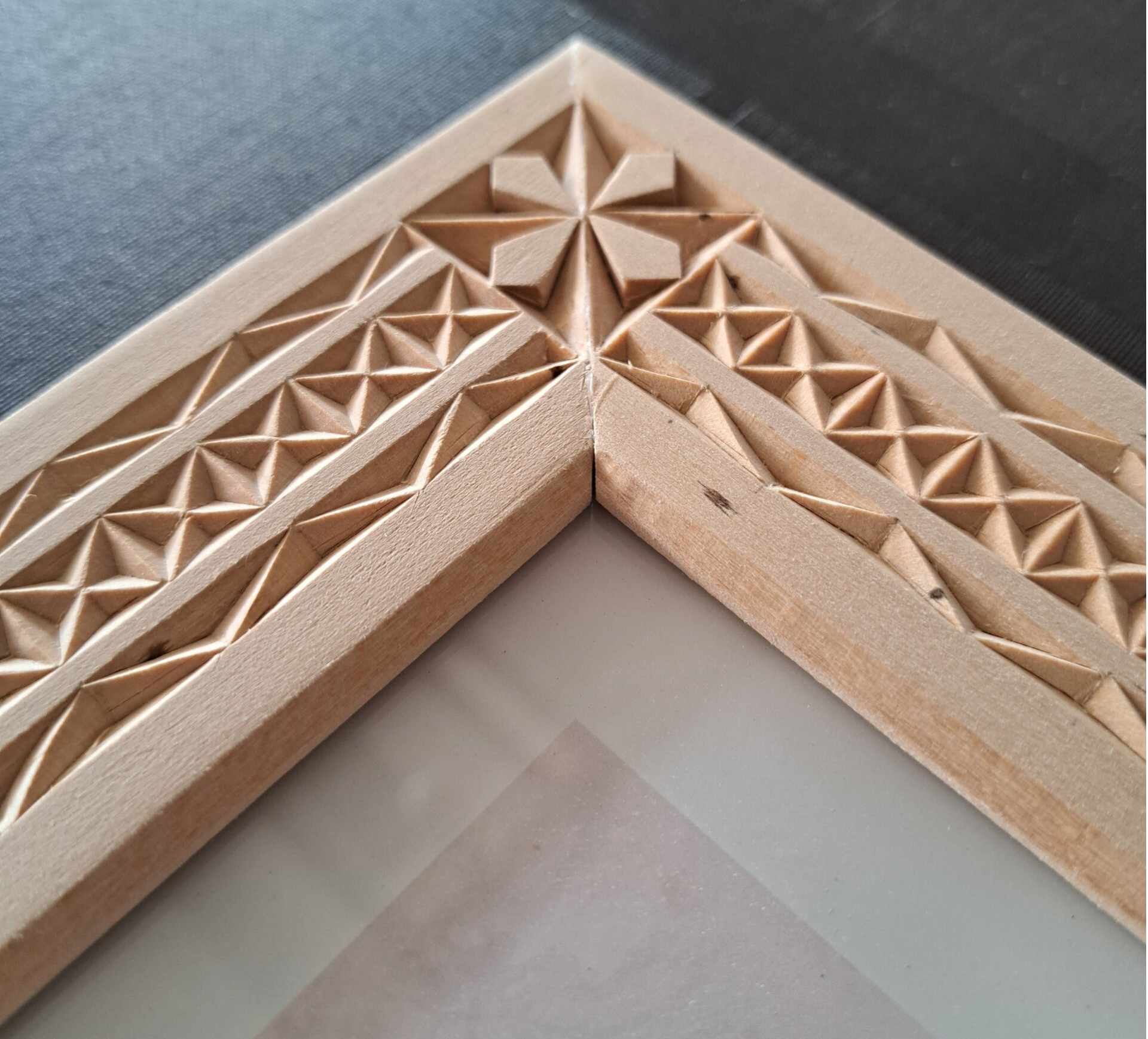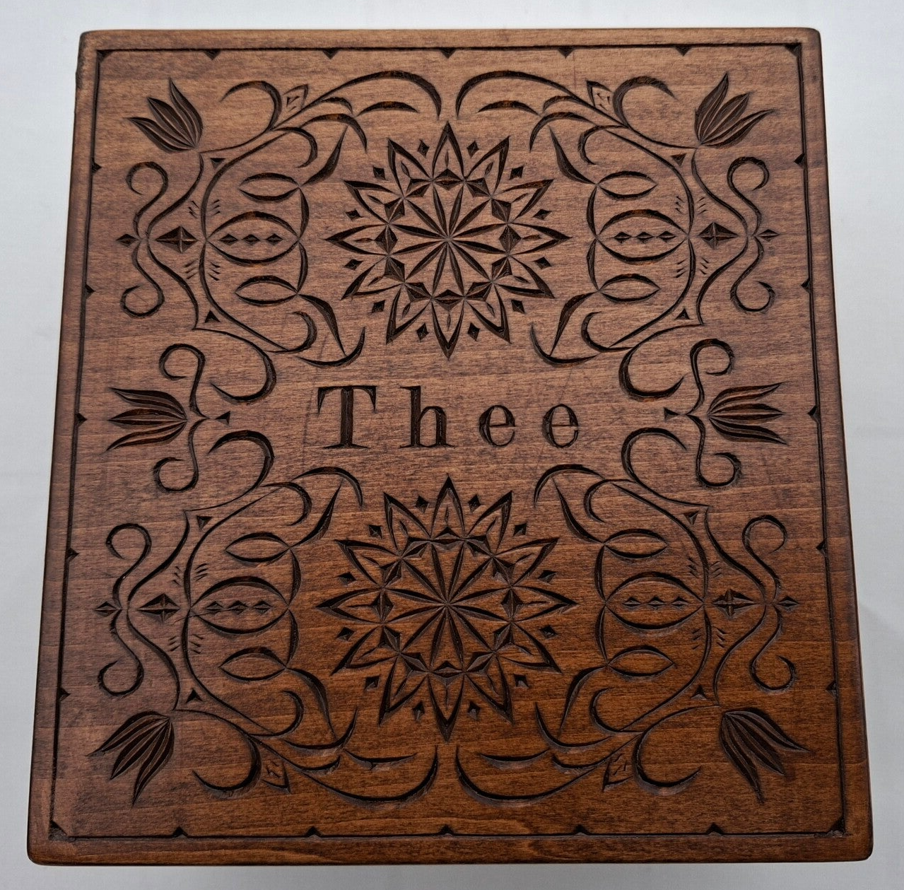 11-7-2025 - Van de eerste theedoos twee zijkanten klaar. Een hele andere stijl dan ik tot nu toe heb gedaan. De kerfsnedes zijn veel kleiner en de figuren zijn niet geometrisch. Er zitten ook een paar moeilijke delen in het patroon. Als je goed kijk kun je dat ook zien. Wel erg leuk om te doen.