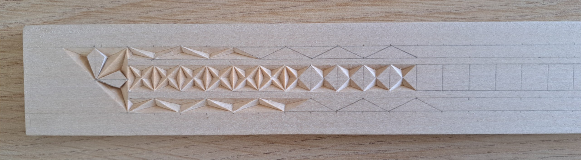 1/5/2025 - Het begin is er. Vier latten gezaagd. En met de eerste gestart. Dit keer het patroon niet met etiketpapier aangebracht, maar met de hand getekend. Het grote voordeel van een patroon direct op het hout getekend is dat je veel beter ziet waar je moet snijden. Het kost wel meer tijd. Maar uiteindelijk is het tekenen ook leuk om te doen.