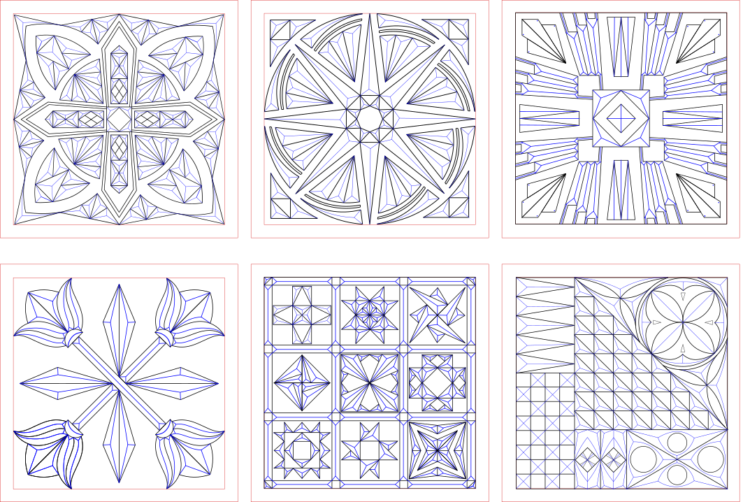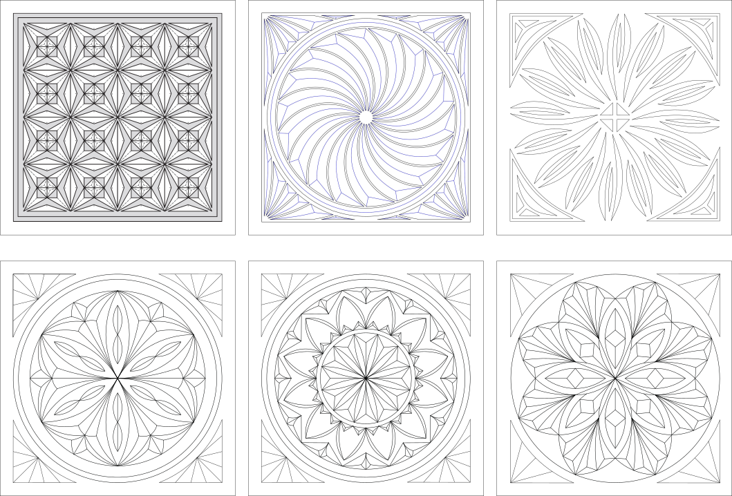 Set van 6 vierkante onderzetters. Komen mooi uitop plankjes van 9 x 9 cm. De stijl van deze onderzetters is wat moderner.